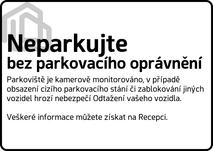 V opačném případě recepce bude volat odtah a náklady následně budou přefakturované na majitele vozu. Dále bude účtován administrativní poplatek ve výši 1 000 Kč za každé nepovolené parkovaní. | | | | Bohužel s touto změnou budeme muset přistoupit k zavedení platby za parkovaní. | | | | S ohledem na vyšší cenu nájemného parkovacích míst ze strany budovy, jsme rozhodli se zavést tzv. sdílené parkovací místa. To znamená, že za menší poplatek budete mít možnost parkovat avšak dle dostupnosti. | | | | "SDÍLENÉ" | - Můžete využít jedno z dostupných míst označených logem naší společnosti, pokud bude volné.