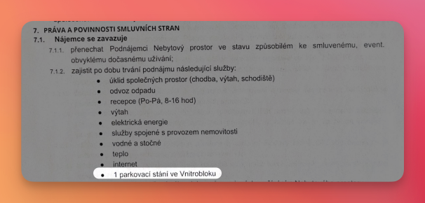 Tyto změny jsou způsobeny zpřísněním pravidel ze strany majitelů budovy, což vyžaduje přizpůsobení stávajících podmínek. | | | | Využívám nebo chci využívat parkování ve vnitrobloku a ve smlouvě nemám uvedeno parkovací místo | | | | Od 1.12.2024 budou platit následující pravidla: | | | | Všechny auta vjíždějící do vnitrobloku musejí mít platné parkovací oprávnění a jejích SPZ musí byt zařazená do interního systému.